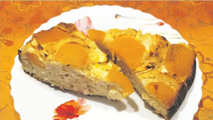 Samaisīju mīklu un izlīdzināju to ar cepamo papīru izklātā 22 centimetru diametra veidnē ar noņemamo gredzenu. Virs mīklas, viegli iespiežot, izkārtoju notecinātas konservēto aprikožu pusītes un nomizotus un gabaliņos sagrieztus ābolus.