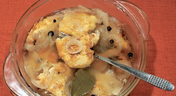 Nomizotus sīpolus sagriezu ripiņās. Katlā ielēju ūdeni, pievienoju cukuru, sāli, piparu graudus, lauru lapas un sīpolus. Piemetu arī dažas krustnagliņas un mazliet kanēļa un piepilināju nedaudz augu eļļas. Visu uzvārīju un 1 – 2 minūtes vēl pavārīju. Tad minūtes piecas padzesēju un pielēju etiķi. To varam liet garšojot – karsta marināde šķitīs pat divreiz stiprāka, taču rezultāts vēlāk būs krietni maigāks. Traukā kārtoju uz pusēm pārgrieztas izceptās fileju karbonādītes un sīpolus no marinādes. Pārlēju ar marinādi un liku pa nakti ledusskapī.