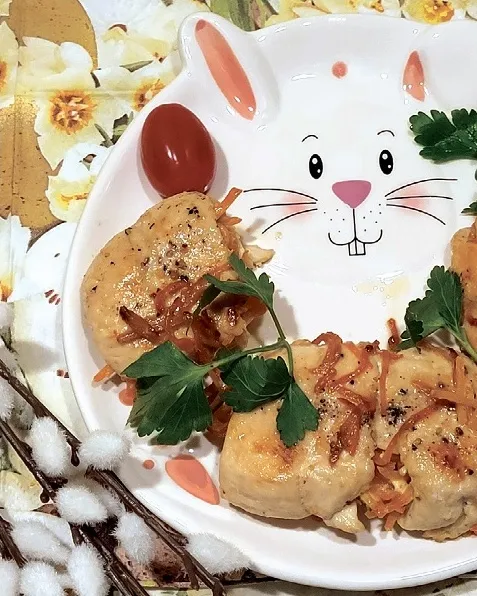 Cāļa krūtiņas fileju sagriezu garenās plāksnītēs, ar gaļas āmuriņu zem pārtikas plēves izdauzīju, pārsmērēju ar majonēzi un apkaisīju ar garšvielām un sāli. Sagatavēm pāri izlīdzināju smalkāk sagrieztus Korejas burkānus un satinu ruletītēs.