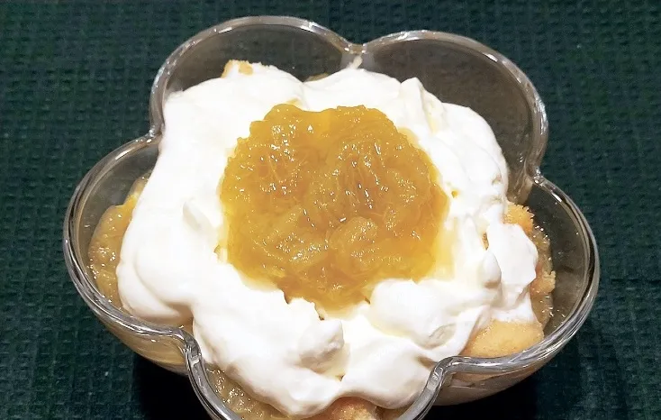 Saputoju saldo krējumu, pakāpeniski piekaisot pūdercukuru un vaniļas cukuru. Beigās piekūlu klāt arī klasisko svaigo krēmsieru, lai veidojas viendabīga masa. Stikla trauciņu apakšu noklāju ar krēma kārtiņu, tad tur izkārtoju ātri pienā iemērktu cepumu gabaliņus. Tiem pāri izlīdzināju balto krēmu, pēc tam – rabarberu biezeni. Tad atkal pāri cepumus, pēc tam krēmu un virspusē – rabarberu masu. Kārtojumu ievietoju ledusskapī, lai garšas savelkas. Vislabāk to tur atstāt pa nakti, taču nepacietīgākie gardumu var mēģināt nobaudīt jau pēc dažām stundām. Ja vēlamies, desertam vēl varam pārkaisīt kanēli, mandeļu skaidiņas vai to rotāt ar ogām.