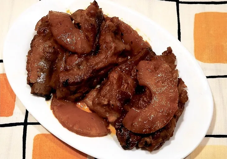 Cūkgaļas gabalu sagriezu pa vienai ribiņai, cenšoties atstāt gaļu kauliņam abās pusēs. Konservēto ananasu riņķīšus pārgriezu uz pusēm. Pannā sakarsētā eļļā ribiņas apgrozot apcepu, tad pārliku katlā. Pievienoju visas pārējās sastāvdaļas, uzvārīju un lēni vārīju vismaz stundu, līdz mērce bija novārījusies apjomā un kļuvusi sīrupaina.