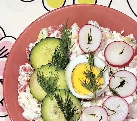 Vispirms izvārīju un atdzesēju olas. Tās nolobīju un sagriezu. Dārzeņus labi nomazgāju un sagriezu vēlamajos gabaliņos. Biezpienu sajaucu kopā ar bezpiedevu jogurtu, piekaisot sāli, piparus un sasmalcinātus diļļu zaļumus. Pēc tam biezpienā uzmanīgi iejaucu arī sagatavotos dārzeņus un vārītās olas. Salātus varam baudīt kopā ar maizi vai vārītiem kartupeļiem.