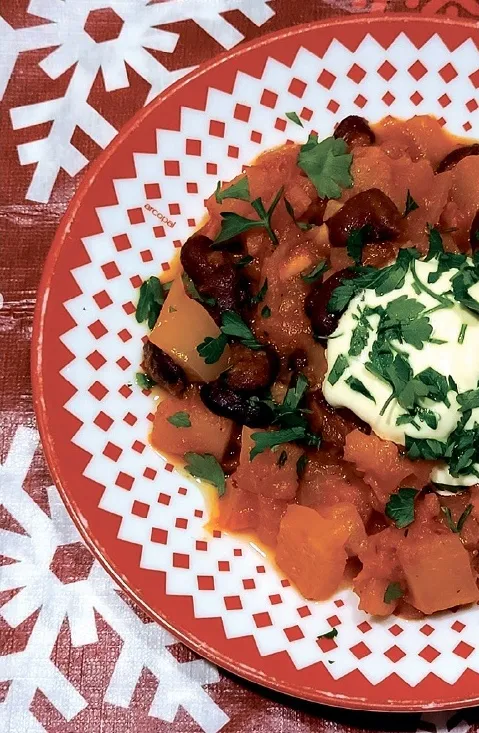 Dārzeņus nomazgāju, nomizoju vai izņēmu sēklas – kas nu kuram bija nepieciešams. Tos sagriezu gabaliņos. Katlā ielēju augu eļļu un tajā apcepu sīpolus, ķiplokus, burkānus, saldos kartupeļus, kabačus un papriku. Pēc tam tā saturu pārlēju ar konservētiem smalcinātiem tomātiem savā sulā. Pievienoju arī garšvielas un sautēju, līdz dārzeņi kļuva mīksti. Tad noskaloju konservētās sarkanās pupiņas un piemaisīju dārzeņiem. Visu kopā vēl vismaz pāris minūtes pasautēju. Šādu sautējumu, pārkaisītu ar sasmalcinātiem pētersīļu zaļumiem, varam baudīt gan ar skābo krējumu, gan arī ar mērcīti, kas pagatavota no pāris ēdamkarotēm bezpiedevu jogurta, ēdamkarotes laima sulas, sasmalcinātām dillītēm, sāls un pipariem pēc garšas. To varam pasniegt arī kopā ar kādu gaļas ēdienu.