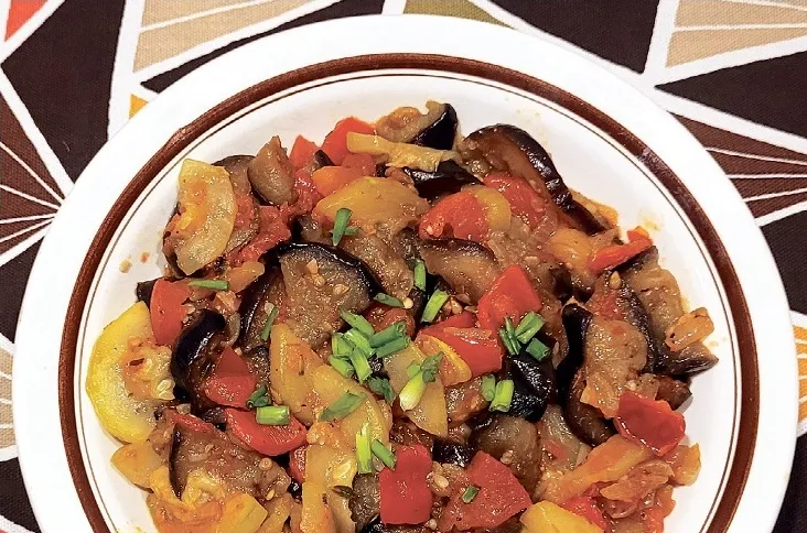 Baklažānu nomazgāju un sagriezu ceturtdaļripiņās. Bļodā pārkaisīju ar sāli un atstāju uz vismaz 10 minūtēm. Pēc tam nomazgāju un nospiedu lieko mitrumu. Baklažānus liku pannā ar augu eļļu un apcepu apmēram sešas minūtes. Jauno kabacīti šoreiz gan nomizoju, tad sagriezu tāpat kā baklažānus, uzkaisīju sāli un cepu augu eļļā 8 – 10 minūtes. No sēkliņām iztīrītu saldo piparu sagriezu nelielos gabaliņos, sīpolu – pusgredzenos, ķiplokus – smalki. Tos pannā ar augu eļļu cepu apmēram 5 minūtes. Pēc tam visus apceptos dārzeņus kopā atkal liku pannā. Vienu tomātu nomazgāju un sagriezu kubiciņos, otru sarīvēju uz rupjās rīves, tādējādi atbrīvojoties arī no mizas. Tomātus pievienoju pārējiem dārzeņiem pannā, piekaisīju vēl sāli, arī piparus un sausās garšvielas. Uzliku pannai vāku un ēdienu sautēju vēl 10 – 12 minūtes līdz gatavībai.