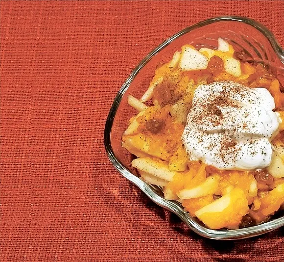 LIELĀS oranžās ogas gabalam nogriezu mizu un mīkstumu uz rupjās rīves sarīvēju. Lielu ābolu nomizoju, izgriezu serdi, bet mīkstumu sagriezu nelielās skaidiņās. Sauju rozīņu nomazgāju, pārlēju ar karstu ūdeni un uzbriedināju vairākas minūtes, pēc tam ūdeni nolēju un rozīnes apsusināju. Bļodā samaisīju ķirbjus, ābolus un rozīnes, pievienojot cukuru un skābo krējumu, un pārkaisīju ar kanēli. Cukuru varam pievienot pat mazāk, nekā receptē norādīts, bet mērcei izmantot, piemēram, bezpiedevu jogurtu.