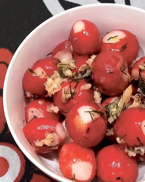 Redīsus rūpīgi nomazgāju, tiem nogriezu “astītes”. Sārtās bumbiņas ieliku polietilēna maisiņā un uz virtuves dēlīša ar koka mīklas rulli “iekaustīju” redīsus tā, lai katrs būtu nedaudz ieplaisājis. Tad tos pārliku traukā, pievienoju ābolu etiķi, eļļu, sāli, piparus, sīki sagrieztus diļļu zaļumus un spiedē sasmalcinātas pāris ķiploka daiviņas. Trauku aizvākoju un vairākas reizes enerģiski sakratīju, lai visas sastāvdaļas labi samaisītos. Vismaz uz stundu to vajadzētu ievietot ledusskapī, kādu reizi gan vēl tā saturu sakratot. Labāk gan galdā celt nedaudz vēlāk, taču arī pēc stundas uzkoda jau ir baudāma.