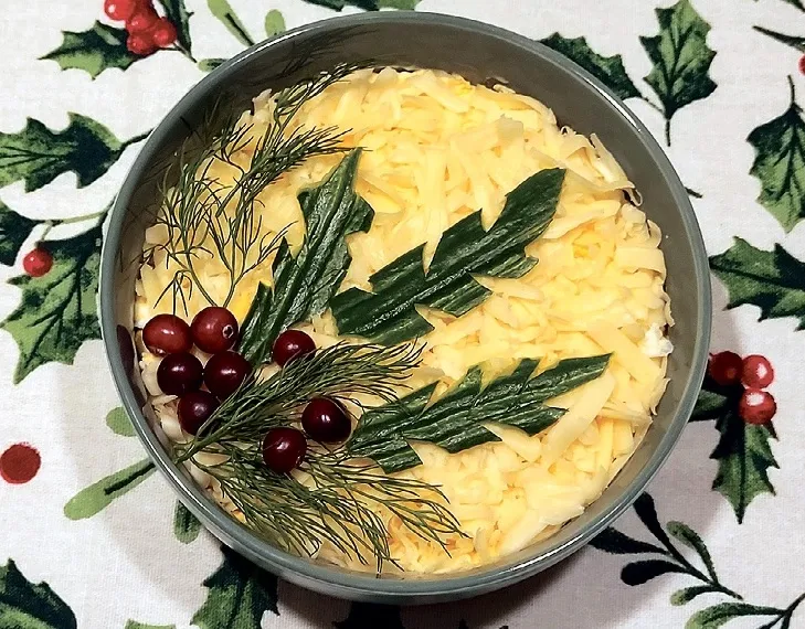 Svaigo gurķi nomizoju un sarīvēju uz rupjās rīves. Izlīdzināju bļodas, kurā gatavoju šos salātus, apakšā un pārsmērēju ar plānu majonēzes kārtiņu. Krabju nūjiņas iztinu no plēvītēm un arī sarīvēju. Tā bija otrā kārta, un tai pāri – majonēzes “sietiņš”. Olas nolobīju no čaumalām un sarīvēju uz rupjās rīves – tas bija trešais slānis. Un atkal pāri nedaudz majonēzes. Visu vienmērīgi pārkaisīju ar rīvētu sieru, greznoju ar zaļumiem un no gurķa mizas izgrieztām lapiņām. Rotājumam un košumam – arī kāda dzērveņu odziņa.