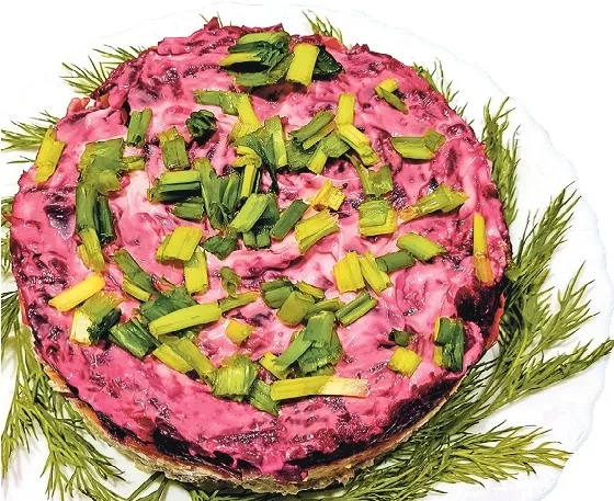 Salātus veidoju kārtām, izmantojot noņemamu metāla gredzenu no kuliču cepamās veidnes. Vispirms uz lēzenā šķīvja izlīdzināju sarīvētos kartupeļus un pārsmērēju ar biezu majonēzi, tad – šprotu kārta ar sīpoliem, atkal nedaudz majonēzes, pēc tam sarīvētās olas, burkāni, katrai kārtai pārsmērējot mazliet majonēzes. Visu noslēdzu ar vārīto biešu kārtu. Arī tai pārsmērēju plānu majonēzes kārtiņu. Virsu pārkaisīju ar smalki sagrieztiem sīpolu lociņiem, rotājumam izmantoju arī diļļu zaļumus.