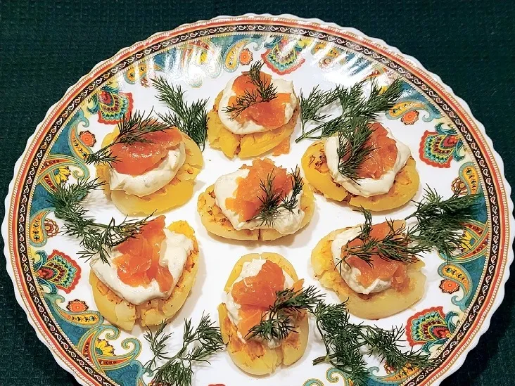 Vārītos kartupeļus izvietoju uz uzkarsētas elektriskās vafeļu cepamās plītiņas iekšējās apakšējās virsmas un piespiežot aizvēru ierīci gandrīz līdz galam. Cepu, līdz kartupeļi kļuva zeltaini. Tā izcepu visus, kas bija iepakojumā. Atkarībā no iekšējo virsmu pārklājuma labāk tās mazliet ietaukot, lai kartupeļi, kam nav pievienotas taukvielas, kā tas ir vafeļu mīklai, nepiedegtu. Izceptās kartupeļu “vafeles” pārsmērēju ar krēmsieru – to izraudzījos ar jau pievienotiem ķiplokiem un zaļumiem – un pārsedzu ar auksti kūpināta laša strēmelītēm. Rotājumam – diļļu zaļumi.