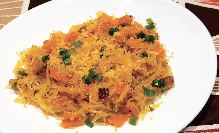 Bekonu sagriezu kubiņos, sasmalcināju sīpolu, tos cepu nelielā eļļas daudzumā, līdz sīpoli kļuva mīksti. Ķirbja daļu nomizoju un sagriezu gabaliņos. Pannā pie sīpoliem un bekona pieliku un izkausēju sviestu, tad tur pievienoju sagrieztos ķirbjus un piekaisīju kaltētu timiānu. Piebēru arī sāli, piparus un citronpiparus. Apmaisot cepu, līdz ķirbja gabaliņi kļuva mīksti, taču vēl neizjukuši. Stikla nūdeles aplēju ar karstu ūdeni pēc norādījumiem uz iepakojuma un pēc minūtēm piecām nokāsu. Tās piemaisīju ķirbjiem, iejaucu arī pusi rīvētā cietā siera, pēc garšas vēl piemetu sāli un piparus. Šķīvī ēdienu pārkaisīju ar atlikušo sieru.