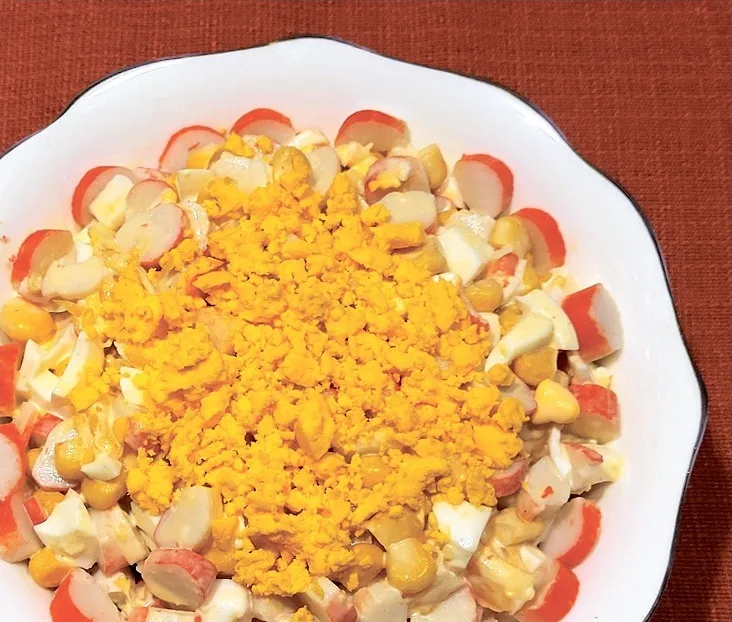 Izvārītas olas sagriezu gabaliņos. Tāpat sagriezu arī no plēvītēm iztītas krabju nūjiņas. Apelsīnu nomazgāju, nomizoju, sadalīju daiviņās, tās savukārt sagriezu gabaliņos. Spiedē sasmalcināju pāris ķiploka daiviņas. Konservētajai kukurūzai notecināju šķidrumu. Sagatavotās sastāvdaļas bļodā samaisīju ar nelielu daudzumu majonēzes. Ja nepieciešams, salātiem vēl varam piekaisīt sāli un piparus.