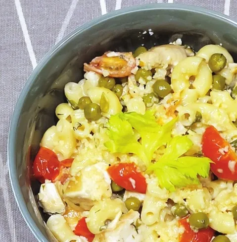 Cāļa filejas izcepu pannā ar sakarsētu augu eļļu zem vāka. Pārkaisīju sāli un maltus melnos piparus. Gatavas tās sagriezu gabaliņos. Siers jau bija sarīvēts. Makaronu radziņus vārīju sālsūdenī. Kad tie jau bija gandrīz gatavi, vajadzētu pielikt saldētos zirnīšus un turpināt vārīt līdz gatavībai, taču konservētos pievienoju mazliet vēlāk – makaroniem vispirms nolēju ūdeni un tad piemaisīju notecinātus zirnīšus. Nedaudz ūdens, kurā vārījās makaroni, saglabāju. Tam pannā pielēju saldo krējumu, iemaisīju pusi paredzētā rīvētā siera, uzkarsēju, tad pieliku cāļa filejas gabaliņus, sasmalcinātus pētersīļu zaļumus un ķiršu tomātiņus, kā arī makaronus ar zirnīšiem. Gatavo ēdienu pārkaisīju ar atlikušo rīvēto sieru.