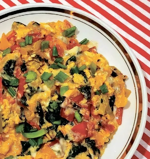 Gan sarkano, gan dzelteno saldo piparu sagriezu strēmelītēs, sasmalcināju sīpolu. Tos pannā apmaisot viegli apcepu augu eļļā. Pēc tam pievienoju spinātu lapas, gabaliņos sagrieztus tomātus, sāli un maltus melnos piparus. Apmaisot cepu pāris minūtes. Tad visam pārlēju kopā ar sāli un pipariem sakultas olas, iemaisīju dārzeņos un cepu dažas minūtes, līdz olas bija jau gandrīz savilkušās. (Šoreiz ēdienu pannā ar lāpstiņu dažas reizes apjaucu, taču, ja olām ar dārzeņiem ļausim cepties savu gaitu, gatavo sacepumu varēsim sadalīt gabalos kā pīrāgu.) Beigās virsū uzdrupināju zilo sieru un pacepu ēdienu vēl.