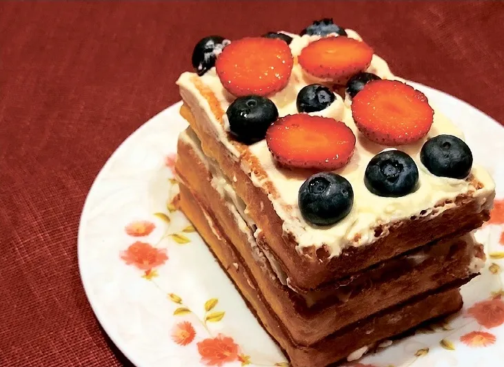 Saputoju saldo krējumu kopā ar pūdercukuru un vaniļas cukuru pēc garšas, īpaši nepārsaldinot, jo vafeles arī ir saldas. Pakāpeniski pieputoju klāt arī klasisko krēmsieru, kā arī, lai krēms būtu stingrāks, saldā krējuma biezinātāju. Noskaloju un apsusināju lielogu mellenes un svaigas zemenes. Nu varēju veidot kūku. Uz cepampapīra vispirms klāju pirmo četrdaļīgo vafeli un pārsmērēju ar krēmu. Tam pāri izkārtoju mellenes, pārsedzu ar otru vafeli, ko savukārt atkal pārsmērēju ar balto masu un pārbārstīju ar mellenēm, kam pa vidu izkārtoju arī zemeņu šķēlītes. Beigās uzklāju trešo vafeli un pārsmērēju ar atlikušo krēmu. Kūkas virsu izrotāju ar mellenēm un zemenēm un ievietoju ledusskapī.