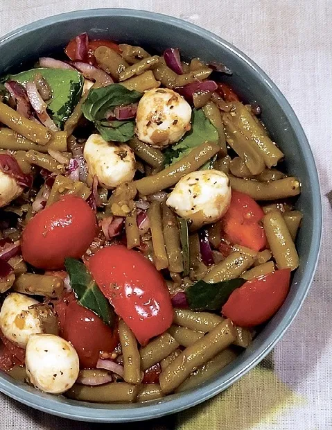 Sarkano sīpolu sasmalcināju, tomātiņus pārgriezu uz pusēm. Pupiņas nokāsu, arī mini mocarellas bumbiņām nolēju šķidrumu un tās apsusināju. Sagatavotās sastāvdaļas bļodā samaisīju kopā ar sasmalcinātām spinātu lapiņām. Balzametiķi sakūlu ar olīveļļu, sāli un pipariem un mērcīti pārlēju salātiem.