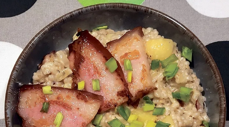 Ņēmu vienu no četriem iepakojumā esošajiem maisiņiem ar pērļu grūbām, tās noskaloju un, vadoties pēc norādījumiem uz iepakojuma, liku tās vārītā ūdenī un vārīju 20 minūtes. Otrā katliņā jāizvāra kartupeļi. Pannā izkausēju sviesta pikucīti un tajā apcepu sagrieztus sīpolus. Daļu kūpināta cūkgaļas vaidziņa sagriezu nelielos gabaliņos, daļu – šķēlītēs. Gaļu dziļākā pannā apcepu. Šķēlītes atliku malā, bet gaļas gabaliņiem pannā pievienoju saceptos sīpolus, notecinātas un uzirdinātas izvārītās grūbas, nelielos gabaliņos sagrieztus vārītos kartupeļus, kā arī garšvielas – kaltētu raudeni, timiānu, muskatriekstu, piparus un sāli. Pielēju saldo krējumu un visu kopā apmaisot sautēju 10–15 minūtes. Izvārīto biezputru pārkaisīju ar sasmalcinātiem sīpolu lociņiem un rotāju ar saceptajām gaļas šķēlītēm.