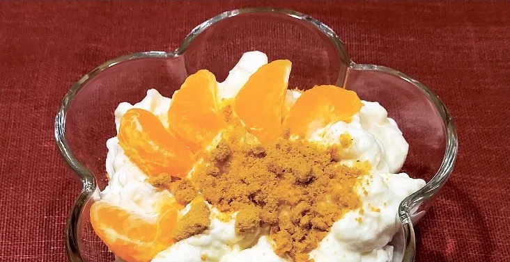 Sagatavotās sastāvdaļas kārtoju stikla trauciņos. Vispirms augļu gabaliņus, tad – piparkūku drumstalas, pēc tam – putukrējumu kopā ar zefīra gabaliņiem. Pārkaisīju piparkūku drumstalas un rotāju ar kādu mandarīna šķēlīti. Varam sākt mieloties jau uzreiz, kamēr cepumi vēl kraukšķīgi, vai arī gardo desertu ievietot ledusskapī, lai garšas labāk sadraudzējas.