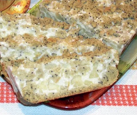 Olas samaisīju ar pāris ēdamkarotēm cukura, pilngraudu auzu miltiem, magoņu sēkliņām, kanēli, šķipsniņu sāls un nedaudz ūdens tā, lai mīkla būtu bieza krējuma konsistencē. Izlīdzināju to ar cepamo papīru izklātā un mazliet ar eļļu ietaukotā garenajā veidnē un cepu līdz 180 grādiem uzkarsētā cepeškrāsnī apmēram pusstundu. Pīrāgu atdzesēju un uzmanīgi ar karoti izņēmu vidiņu, lai paliek tikai apakša un apmalītes. Mīkstumu sadrupināju.