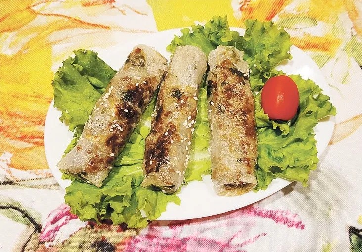 Katru rīspapīra loksni viegli samitrināju ar ūdeni, tai tā kļūtu elastīgāka un pakļautos locīšanai. Uz katras liku pildījumu, satinu ruletītē un vēl apsusināju papīra dvielī. Ruletītes izkārtoju pannā ar nelielu augu eļļas daudzumu un apcepu līdz zeltainai garoziņai. Pēc tam pārkaisīju ar sezama sēkliņām.