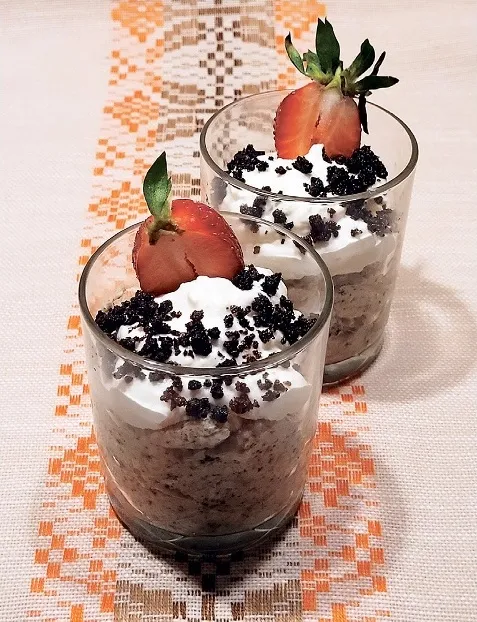 Rudzu rīvmaizi kopā ar sviestu un cukuru uz pannas apgrauzdēju, pēc tam atdzesēju un sasmalcināju – drupatas varam sablendēt vai samalt. Nepilnu ēdamkaroti atliku pārkaisīšanai, pārējās samaisīju kopā ar jogurtu, kanēli un pusi tējkarotes vaniļas cukura. Saldo krējumu saputoju ar otru pusi tējkarotes vaniļas cukura. Pusi putukrējuma iejaucu maizes un jogurta maisījumā. Krēmu sadalīju divos stikla trauciņos un virsū katrai porcijai izliku atlikušā putukrējuma “cepures”. Pārkaisīju atliktās saldās maizes drupatas, greznoju ar ogām. Uz brīdi gardumu vēl ievietoju ledusskapī.