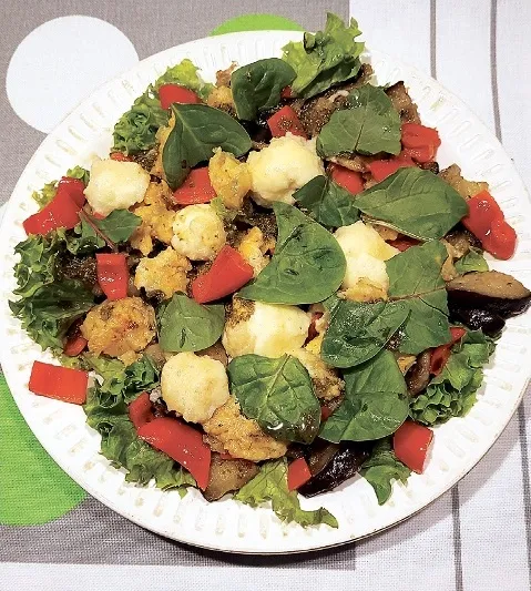 JA IZMANTOJAM svaigu saldo piparu, ieteicams to cepeškrāsnī izcept mīkstu un pēc tam novilkt miziņu. Sarkano saldo garo papriku šoreiz sagriezu gabaliņos un apcepu pannā uz plīts līdz gatavībai. Baklažānu sagriezu gabaliņos, apviļāju kukurūzas cietē un sakarsētā eļļā cepu līdz zeltainumam. Grūtāk gāja ar siera bumbiņām. Tās apviļāju cietes, garšvielu, olas un rīvmaizes panējumā, taču, cepot uzkarsētā eļļā, tās sāka kust un formu nesaglabāja. Noskalotus dažādu lapu salātus izklāju lēzenā šķīvja apakšā. Lieliski te noder spinātu lapiņas. Pēc tam izliku apceptos baklažānu gabaliņus, tad – saldos piparus un mocarellu. Mērcīti pagatavoju, samaisot kopā sezama eļļu, sojas mērci un pesto. Ar to pirms baudīšanas pārlēju krāšņos salātus.