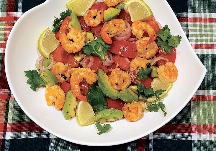 Garneles apcepu sviestā. Avokado, tomātus un šalotes sīpolus nomizoju un sagriezu gabaliņos. Mērcei samaisīju kopā olīveļļu, sāli, cukuru, piparus un piespiedu laima sulu. Salāttraukā liku sagrieztos dārzeņus, tiem pievienoju sasmalcinātus zaļumus un uzmanīgi sajaucu ar pagatavoto mērci. Un tad – arī apceptās garneles.