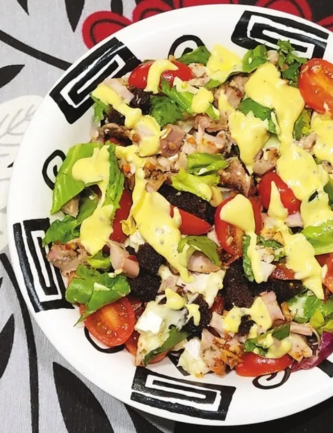 RUDZU MAIZES šķēlēm nogriezu garoziņas, mīkstumu sagriezu stienīšos, pārslacīju ar augu eļļu un pannā uz plīts apgrauzdēju. To varam darīt arī cepeškrāsnī. Pēc tam pagatavoju mērci. Majonēzi labi samaisīju ar sinepēm, jogurtu, baltvīna etiķi, sāli un pipariem. Ja nu mērce šķiet pārāk bieza, tai varam pievienot mazliet ūdens. Ķiršu tomātiņus pārgriezu uz pusēm, kūpinātos vistas girosus un brī sieru sagriezu gabaliņos. Piemaisīju saplucinātus dažādu lapu salātus un visu pārlaistīju ar pagatavoto mērci.