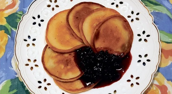 Trīs olas samaisīju ar cukuru – to ieteicams likt pat mazāk par receptē norādītajām trīs karotēm, jo jogurts satur labu tiesu cukura. Olām piekaisīju glāzi miltu, nedaudz sodas un šoreiz pielēju zemeņu jogurtu ar bifido baktērijām. Visu labi samaisīju, lai izveidojas pankūku mīkla. Ja nu tā šķiet par biezu, vēlams pieliet nedaudz piena. Cepu pannā ar nelielu augu eļļas daudzumu no abām pusēm kā biezās pankūkas.