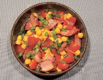 Vairākas bekona – kūpinātas cūkgaļas krūtiņas – šķēlītes, kā arī tomātus sagriezu vidēja lieluma gabalos. Sīpolu lociņus sasmalcināju. Turku zirņiem notecināju šķidrumu.