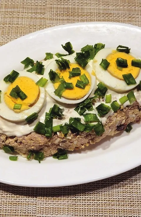 Vārītu lāpstiņas gaļu sarīvēju uz rupjās rīves, tāpat arī – nolobītu vārītu olu. Ķiploku sasmalcināju spiedē. Samaisīju ar skābo krējumu, sinepēm un sīki sagrieztiem no eļļas izņemtiem saulē kaltētajiem tomātiem. Piekaisīju arī sāli un piparus. Bet, ja vēlamies pagatavot viendabīgāku pastēti, sastāvdaļas varam kopā sablendēt. No masas izveidoju kukulīti, pārsmērēju ar krējumu, rotāju ar vārītas olas ripiņām un sasmalcinātiem sīpolu lociņiem.