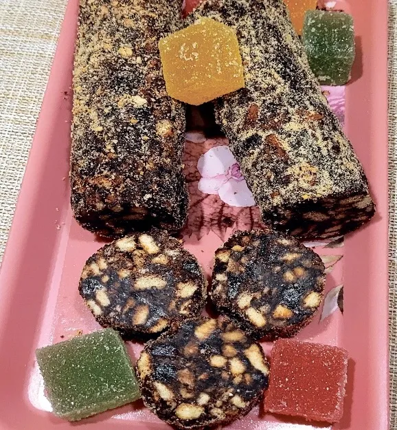 Nu varēju veidot desu. Folijas loksni (te varam izmantot arī pārtikas plēvi) pārliecu dubultā, lai tā būtu biezāka un izturīgāka. Ar tās palīdzību, stingri ar rokām saspaidot, lai masa nebūtu birzīga, vispirms satinu vienu desu, pēc tam no atlikušās brūnās cepumu masas satinu otru desu (masu savulaik esmu arī tikai pārlikusi kādā bļodiņā, stingri piespaidot, un vēlāk, vēsumā sastingušu, sagriezusi gabaliņos). Tās ievietoju ledusskapī, varam uz dažām stundām noslēpt saldētavā un arī vēlāk glabāt tur. Pēc tam gardumu no folijas attinu un sagriezu šķēlītēs.