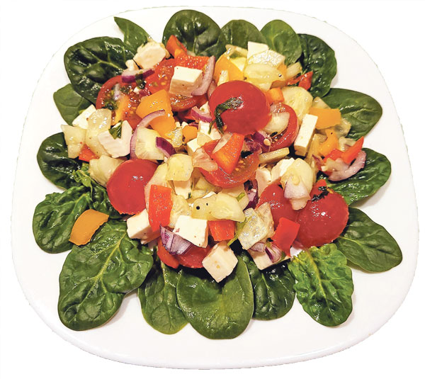 Visas salātu sastāvdaļas, bez spinātiem, samaisīju kopā ar olīveļļu, sāli un pipariem pēc garšas. Pēc tam uz šķīvja vispirms izkārtoju spinātus, virs tiem kaudzītē – arī pārējās sajauktās salātu sastāvdaļas. Lai garšas labāk savilktos, pagatavotos salātus varam uz kādu brīdi vēl ievietot ledusskapī.