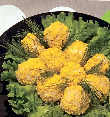 Konservētajam tuncim nolēju eļļu un zivi ar dakšiņu sasmalcināju. Liku bļodā, pievienoju sarīvētos olu baltumus, rīvēto sieru un majonēzi. Visu samaisīju, ja masa šķiet par sausu, majonēzi varam pielikt vēl. Piekaisīju arī mazliet sāls un maltus melnos piparus. Visu vēlreiz rūpīgi samaisīju. No zivju masas izveidoju bumbiņas apmēram valrieksta lielumā. Tās katru apviļāju sarīvētajos olu dzeltenumos un izkārtoju uz lēzenā šķīvja, kas izklāts ar lapu salātiem un diļļu zaļumiem.