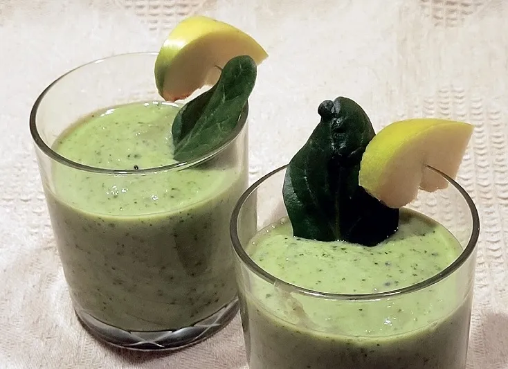 Šoreiz izmēģināju pārsvarā zaļo augļu salikumu ar spinātiem. Visas paredzētās sastāvdaļas nomazgāju, nomizoju, kas bija jānomizo, pēc tam sagriezu. Sagatavotajiem augļiem un spinātiem blendera krūzē pievienoju rūgušpienu ar tajā pirms minūtēm desmit iemērktām čijas sēklām, kā arī medu, pēc izvēles te varam pielikt ledu, un visu kopā sablendēju viendabīgā masā. Tam bija vajadzīga nepilna minūte.