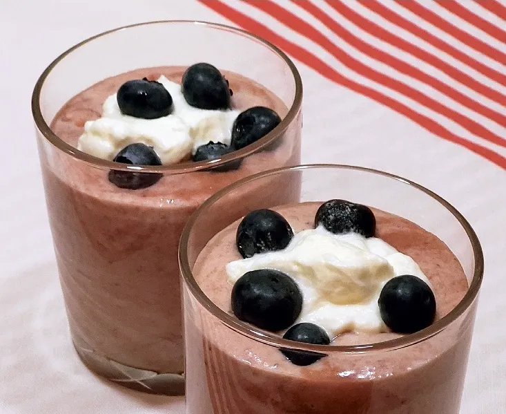 Zemenes un banānus nomazgāju un apsusināju. Ogas un nomizotus banānus sagriezu, blendera krūzē sasmalcināju un iecilājot pievienoju atsevišķi saputotu saldo krējumu. Masu pārliku stikla trauciņos un rotāju ar putukrējuma piciņu un mellenēm. Pārkaisīšanai labi piestāvēs arī sadrupināti rieksti.