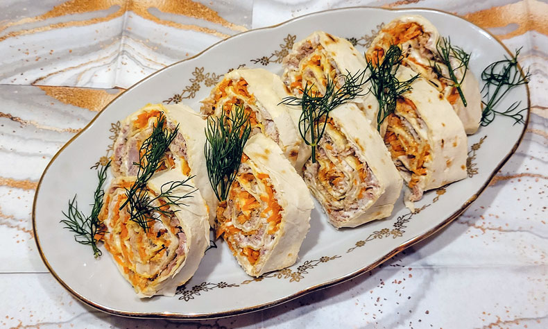 Lavaša plāksni uz virsmas, kas izklāta ar dubultu pārtikas plēvīti, pārsmērēju ar plānu kārtiņu kausētā siera. Pāri pa visu virsu izlīdzināju sarīvēto vārīto gaļu, pēc tam – Korejas burkānus un ķiplokus. Lavašu ar pildījumu, sākot no vienas malas, uzmanīgi, lai nesaplīst, saritināju stingrā ruletē un tad ietinu pārtikas plēvītē. Vismaz uz divām stundām veltni ievietoju ledusskapī. Pēc tam to attinu no plēvītes un sagriezu šķēlēs. Burvīga un garda, sātīga un mazliet pikanta uzkoda!
