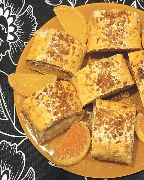 LAVAŠU IESPĒJAMS IZMANTOT ne tikai sāļajiem, bet arī saldākiem gardumiem. Bļodā labi samaisīju olu ar biezpienu, skābo krējumu, cukuru un kukurūzas cieti. Garšai pievienoju citrona miziņu. Izklāju taisnstūrveida lavaša plāksni, ērtības labad to pārgriezu uz pusēm. Tad ar balto masu plānā kārtiņā (ne līdz pašām malām) pārsmērēju vienu daļu, uzkaisot arī nelielos gabaliņos sagrieztu marmelādi, to pārsedzu ar otru pusi un atkal pārsmērēju ar pildījumu, uzkaisot marmelādi. Pēc tam visu uzmanīgi satinu ruletē. Līdzīgi rīkojos ar otru plāksni, tādējādi iegūstot divas ruletes. Tās pārsmērēju ar sakultu olu, bet virspusi vēl pārkaisīju ar brūno cukuru. Abas ruletes novietoju uz plāts, kas izklāta ar cepamo papīru, un ievietoju līdz 180 grādiem uzkarsētā cepeškrāsnī. Atkarībā no krāsns pildījums būs izcepies un virskārta gaiši brūna pēc 20 – 25 minūtēm.