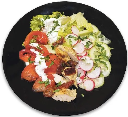 Tomātus, gurķus un redīsus noskaloju un sagriezu gabaliņos. Noskalotus un apsusinātus ledus salātus saplucināju. Uz lēzenā šķīvja kārtoju salātu lapas, izliku pagatavoto jogurta un zaļumu mērcīti, sagrieztos gurķus, tomātus, redīsus, kā arī mazliet ar saulē kaltēto tomātu eļļu apslacītus ceptas cāļa krūtiņas filejas gabaliņus un sīkāk sagrieztus saulē kaltētos tomātus. Putnu gaļas vietā gavēņa laikā te varam izlīdzēties arī, piemēram, ar avokado.