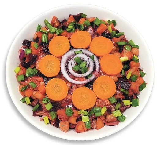Šādu dārzeņu salātu pagatavošanai bietes iegādājos jau izvārītas, bet kartupeļus un burkānus izvārīju, atdzesēju un notīrīju. Sīpolu nomizoju un sagriezu kubiņos. Pēc izvēles, tos, lai atbrīvotos no sīvuma, vēl varam apliet ar vārītu ūdeni.