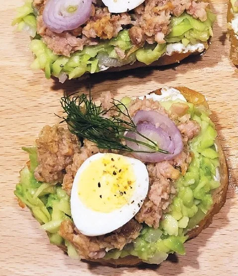 Maizi varam izraudzīties gan rudzu, gan pilngraudu vai kādu citu iecienīto. Šķēlītes nedaudz pārslacīju ar olīveļļu un no abām pusēm apcepu pannā uz plīts. To iespējams paveikt arī tosterī vai cepeškrāsnī. Atdzisušas maizītes pārsmērēju ar krēmsieru. Tad virsū katrai izliku pa ēdamkarotei avokado smēriņa, pēc tam – konservēto tunci un vārītas paipalu oliņas. Nekaitēs arī kāda dillīte.
