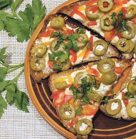 PILNGRAUDU TOSTERMAIZES ŠĶĒLES apcepu pannā uz plīts. Lieliski tas izdosies tosterī vai arī cepeškrāsnī. Tad tās katru ar asu nazi pa diagonāli pārgriezu uz pusēm. Saldo piparu iztīrīju no sēklām un smalki sagriezu, bet zaļās olīvas – ripiņās. Spiedē sasmalcināju ķiplokus un samaisīju ar krēmsieru, piekaisot arī sāli un piparus garšai.