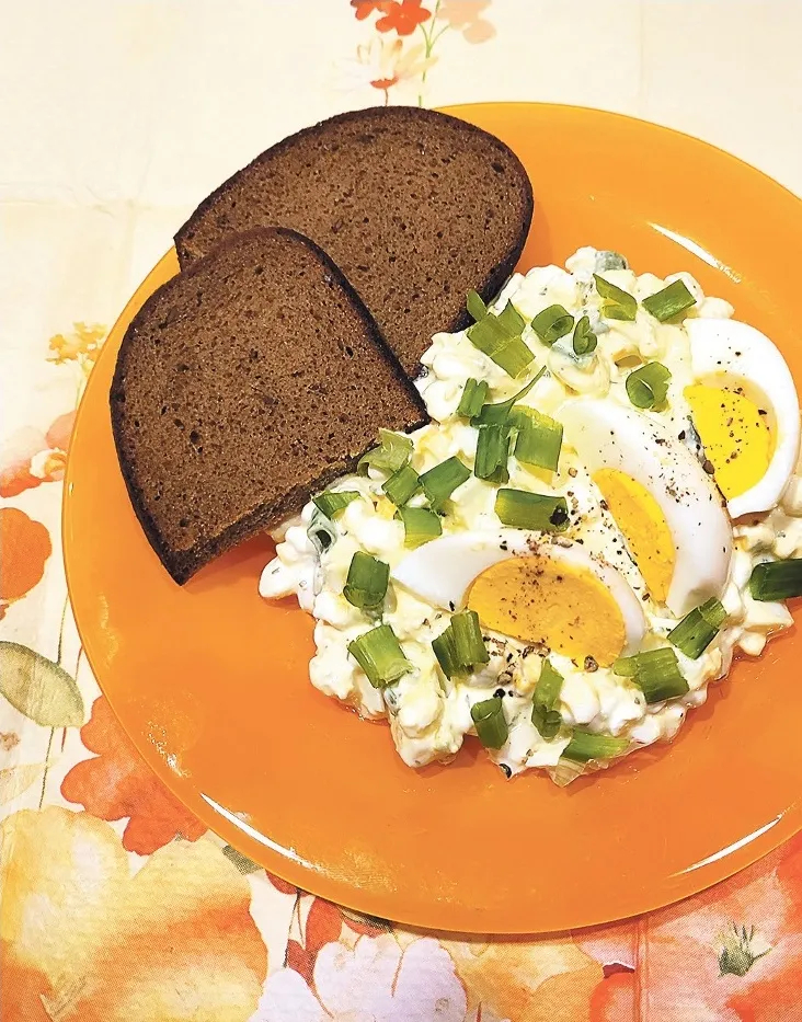 Mājas siers ar vārītām olām un sīpolu lociņiem