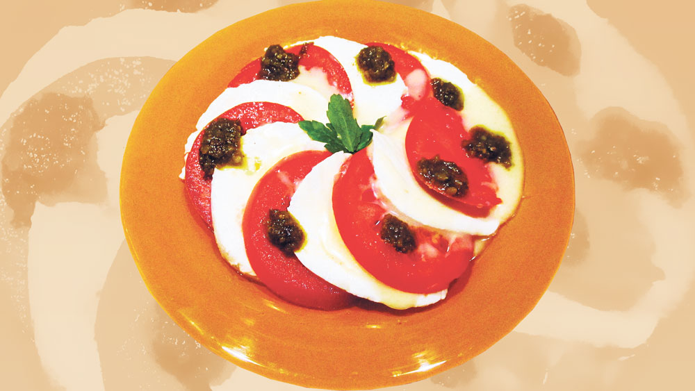 Sagriezu šķēlēs notecinātu sieru un tomātu. Pamīšus tos izkārtoju uz lēzenā šķīvja, pārkaisīju mazliet sāls, pārlaistīju ar balzametiķa mērci un vietām uzliku bazilika pesto. Visu vēl varam rotāt ar svaiga bazilika lapiņām.