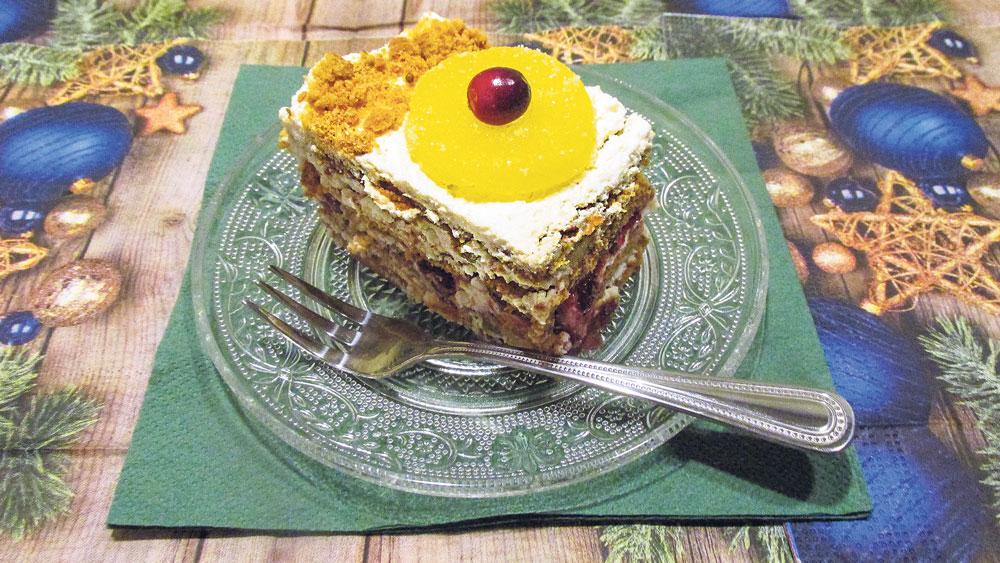 Mazliet apmērcēju piparkūkas kafijā un veikli (lai apakšējā kārta nebūtu pārāk izmirkusi) liku tās cieši citu pie citas tortes pamatam (šoreiz to veidoju no 4×3 jeb 12 cepumiem). Pārsmērēju šo kārtu ar putukrējuma un biezpiena masu un pa virsu vienmērīgi izkaisīju mazos gabaliņos sagrieztu marmelādi. Atkal apmērcēju piparkūkas kafijā un liku no tām nākamo kārtu. To pārsmērēju ar biezpiena masu kā iepriekš, tikai tagad te uzklāju arī dzērveņu ievārījumu. Pēc tam – atkal kārta cepumu un pāri biezpiena masa, bet virs tās –“izmētāti” marmelādes gabaliņi un kafijā apmērcēto piparkūku kārta. Pāri – atlikusī putukrējuma un biezpiena masa, kas vienmērīgi jānoklāj pa tortes virsmu. Tā kā torti veidoju uz dēlīša, kas izklāts ar foliju, varēju ar šo masu apsmērēt arī tortes sānu malas un pēc tam tās “apmest” ar sadrupinātām piparkūkām. Atkarībā no greznošanai izvēlētajiem produktiem, torti varam rotāt vai nu uzreiz, vai īsi pirms pasniegšanas, bet tai vismaz 12 stundas, pat ilgāk, būtu jāglabājas ledusskapī, lai sastāvdaļas labi “sadraudzējas”.