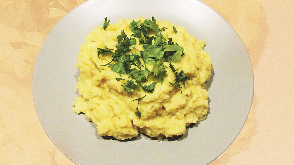 Palielo ziedkāpostu noskaloju un sagriezu gabalos, pievienoju saceptajiem sīpoliem un ķiplokiem pannā un pielēju apmēram pusglāzi buljona (atkarībā no puķkāpostu daudzuma to varbūt vajadzēs mazāk). Uzliku pannai vāku un sautēju, līdz kāposti mīksti. Daudz laika tam nevajadzēja. Pēc tam noņēmu no plīts un pannas saturu ar rokas blenderi sasmalcināju viendabīgā biezenī. Tam piekaisīju sāli, kā arī piparus – labāk baltos. Visu labi samaisīju, izliku uz šķīvja un pārkaisīju ar sasmalcinātiem zaļumiem. Šādu biezeni varētu papildināt ar zilo sieru, taču to jau biju izlietojusi. Lieliska piedeva gaļas ēdieniem vai arī, piemēram, cāļu akniņām.