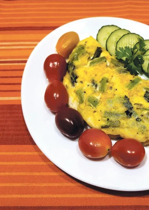 Olas viegli sakūlu bļodiņā, piekaisot arī sāli un piparus, un lēju pāri sparģeļiem pannā. Visu apmaisīju, lai veidojas omlete. Cepu, līdz olas nedaudz sarecēja, tad apvērsu otrādi un uzkaisīju sarīvētu sieru. Pēc neilga laiciņa omleti pārliecu uz pusēm un vēl nedaudz apcepu arī no otras puses.