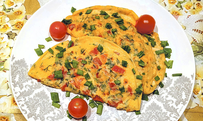 Olām pielēju pienu, piekaisīju miltus un labi samaisīju, lai nepaliek kunkuļi. Noskaloju un apsusināju sīpolu lociņus un diļļu zaļumus, tos smalki sagriezu un pievienoju olu masai. Tomātu nomazgāju, sagriezu kubiņos un arī pieliku klāt, piekaisīju sāli pēc garšas un visu samaisīju. No olu masas pannā ar augu eļļu izcepu divas omletes. Kad omletes viena puse jau bija apcepusies, apvērsu to uz otru pusi un atkal apcepu. Pēc tam vienai pusei uzkaisīju uz vidēji rupjas rīves sarīvētu sieru un pārliecu omletes malu pāri tā, lai siers būtu pārsegts. Gardas brokastis gatavas.