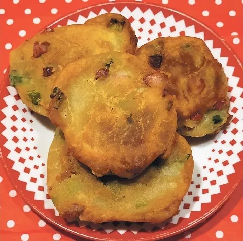NO MĀJĀS PIEEJAMĀM IZEJVIELĀM izcept pankūkas ir pavisam vienkārši, turklāt mīklu varam papildināt, pievienojot, piemēram, vārītas olas un lociņus. Bļodā iesitu vienu olu, piekaisīju sāli un piparus. Visu ar dakšiņu labi sakūlu. Pēc tam pielēju kefīru – tam jābūt siltam, vismaz istabas temperatūrā. Tikko no ledusskapja izņemtu vēl vajadzētu viegli uzsildīt uz plīts vai mikroviļņu krāsnī. Tad piejaucu sodu, lai pankūkas būtu “pufīgākas”. Visbeidzot pa daļām piemaisīju izsijātus miltus, raugoties, lai nebūtu kunkuļu. Iepriekš gan būtu jāizvāra divas olas, taču to nebiju paveikusi, tādēļ šoreiz izlīdzējos ar ledusskapī atlikušo gabaliņu cāļa desas, kuras sastāvā ir arī vārītas olas, – to sagriezu nelielos kubiņos. Sagriezu arī sīpolu lociņus. Šo pildījumu piejaucu mīklai, piekaisot vēl mazliet sāls un piparu.