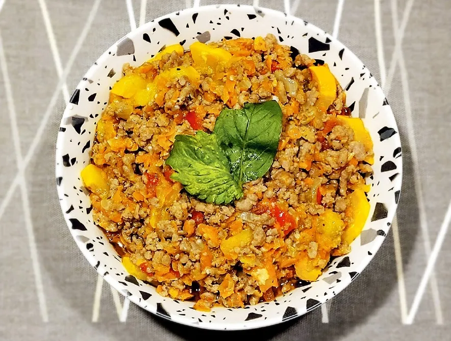Uzkarsētā eļļā apcepu sagrieztus sīpolus un sarīvētus burkānus. Kad tie jau bija mīksti, pievienoju malto gaļu, piekaisīju sāli un piparus un apmaisot cepu vairākas minūtes, līdz gaļa kļuva gaiša. Pēc tam pieliku ceturtdaļšķēlītēs sagrieztus kabačus (jaunos varam pat nemizot) un visu cepu vēl apmēram septiņas minūtes. Tad pievienoju arī smalki sagrieztus svaigus tomātus, spiedē sasmalcinātus ķiplokus un Provansas garšaugu maisījumu, apjaucu, uzliku pannai vāku un uz vidējas uguns sautēju visu vēl vismaz desmit minūtes līdz gatavībai.