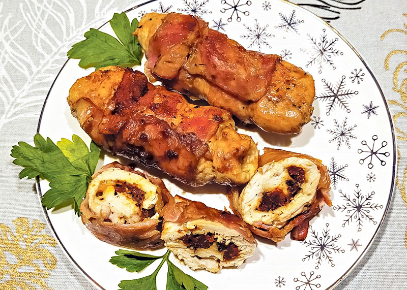 Pildītas cāļa filejas ruletītes bekonā